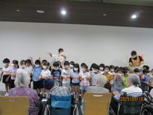 8月6日(水)三恵保育園の子どもたちが、長寿荘の入居者様と一緒に 歌やリズムをとって楽しく過ごしました。