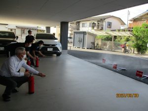 火災がおきた時、入居者様の安全確保に備えるため 避難訓練、消火訓練を行いました。 避難誘導、消火器の取り扱いや初期消火の実地訓練の指導を受けました。