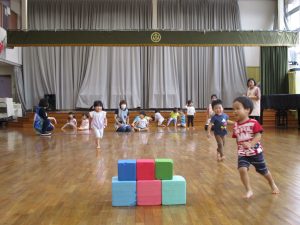 2021年9月3日 / 最終更新日 : 2021年9月3日 三恵保育園 雨の日のサーキット遊び 雨天が続きます。今日のホールは前半ちゅうりっぷ組が使用しました。 初めの運動会遊びでは、〝右回りに走る〟〝終わったら後ろに並ぶ〟等のルールを守ることを教えていきます。 サーキット遊びでは、先生の見本を見て跳ぶ、走る、バランスなど上手にできていました。 もも組さんのかわいい応援も嬉しかったですね!