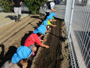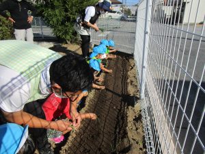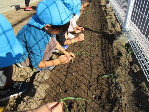 2021年11月4日 / 最終更新日 : 2021年11月4日 三恵保育園 玉ねぎの苗植え 来年のお泊り保育で作るカレーライスのため、今日ひまわり組の子どもたちが玉ねぎの苗植えを初体験しました。 細い苗をそっと土の上において、優しく土をかけてあげた後は、「美味しくな~れ」のおまじないです。 大きく成長して美味しい玉ねぎがたくさん出来るといいですね!