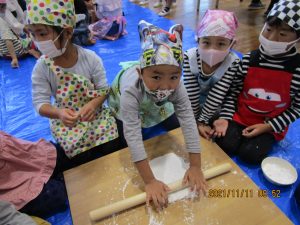 2021年11月11日 / 最終更新日 : 2021年11月11日 三恵保育園 おきりこみ作り 群馬のソウルフード「おきりこみ」をゆり組さんが挑戦しました。 今年は米粉を使っての体験なので麺踏みは省きました。やわらかい生地の感触が気持ち良かったのか子どもたちのテンションも⤴。 伸ばす作業や切る作業も楽しんで取り組んでいました。 県内でも味付けは様々で、お昼には高崎仕様でみそ味のおきりこみうどんを堪能しました!ごちそうさまでした!