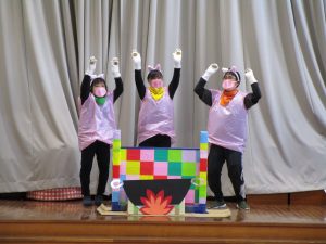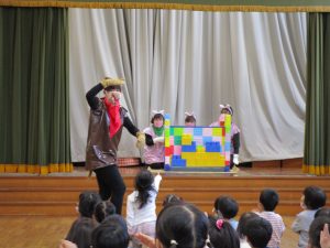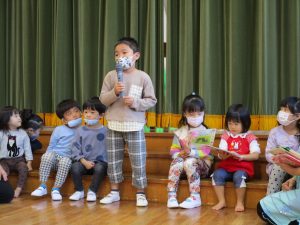 2021年11月16日 / 最終更新日 : 2021年11月16日 三恵保育園 11月のお誕生会 11月のお誕生会です! 今日のメインイベントは、「3匹の子ぶた」の劇です。みんなも良く知っているお話だけに、子ども達も楽しそう♬ 先生だとわかっていても、オオカミが傍に来ると泣き出してしまう子も・・・💦 最後には、子ぶたも狼も一緒に歌を唄って仲直りです。