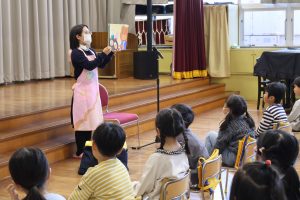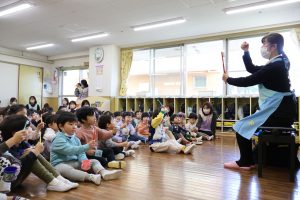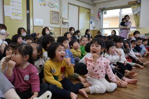 2026年1月29日 / 最終更新日 : 2026年1月29日 三恵保育園 歯科保健指導 高崎市歯科医師会の歯科衛生士の方による歯科保健指導の日です。4・5歳児と0~3歳児の2グループに分かれて、紙芝居で歯磨きの大切さを、大きな歯ブラシを使って正しい歯磨きの仕方を丁寧に教えてもらいました!「あまいものはちょっとにしよう」 「よく噛んで食べよう」「食べたら歯磨き」の3つのお約束もしっかり守れそうですね。