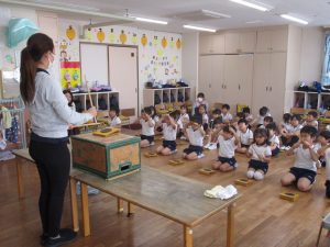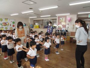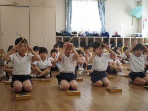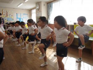 年中組は基本動作に加えリズム打ちも行い、子どもたちは最後まで真剣に取り組んでいました。