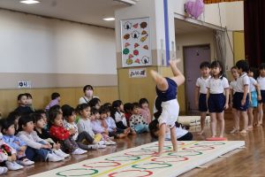 最後は、ゆり組による器具発表です。「年長になったらこんなことが出来るんだ」と見ていた子どもたちは尊敬の眼差しで見つめていました。