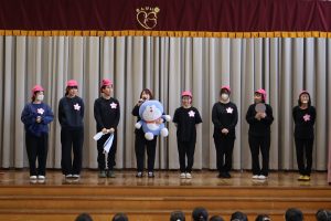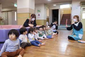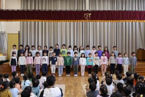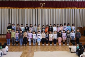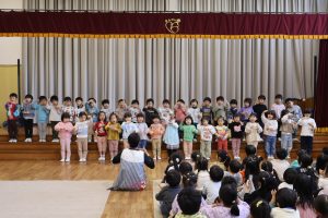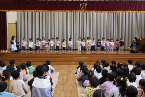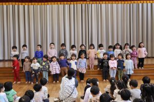 卒園や進級を迎える前に、「大きくなるっていう事は?」どんなことが出来るようになるのか先生たちが見せてくれました。服が小さくなる、高い所にのぼれる、大人の歯がはえる、水に顔をつけられる、転んでも泣かない、小さい子に優しくできる等、みんなできるようになったかな?もも組からゆり組の子どもたちの歌の発表は、元気よくしっかり歌うことが出来ました。