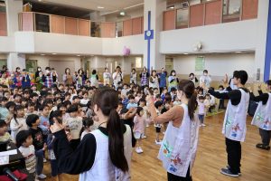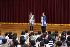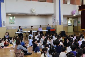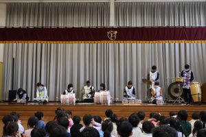 新しい体操「ポチっとくん体操」を元気に踊った後は、マーチングで演奏する2曲を先生たちが披露しました。